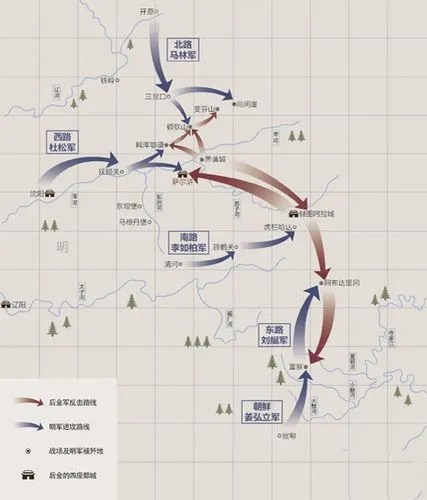 明与后金之著名战役。万历四十六年(1618),后金军攻陷抚顺、清河(在今辽宁本溪)等地。明廷决定大举反击。次年,经略杨镐统兵八万八千余人,号称二十四万(一作四十七万),分四路合击赫图阿拉。努尔哈赤得侦卒探报,采取“凭尔几路来,我只一路去”的方针,只留少数兵力留守后方,集中八旗六万之众,首先迎击左翼中路的杜松军。萨尔浒(今辽宁抚顺县东北浑河南岸)之役,杜松及所部三万之众,悉被歼灭。明北路马林军闻杜松已败,急据尚间崖(距萨尔浒约三四十里)掘濠坚守。努尔哈赤移师击之,一举尽歼,马林仅以身免。明南路刘綎军绕道进逼赫图阿拉,以路远不知萨尔浒败讯。努尔哈赤命降将持杜松令箭,催刘部速进,诈称杜部已近敌城。刘綎信之,亲率前军进击,中伏战死,南路军亦败。惟右翼中路军李如柏部,因杨镐闻败后急檄撤退,得免。是役,明折军四万三千余人,文武官三百余人,其中杜松、刘綎均一时名将。后金军死伤不过数百人。这是后金与明朝兴亡史上的重大转折。(来源:中国历史大辞典·下卷, 2000-03)