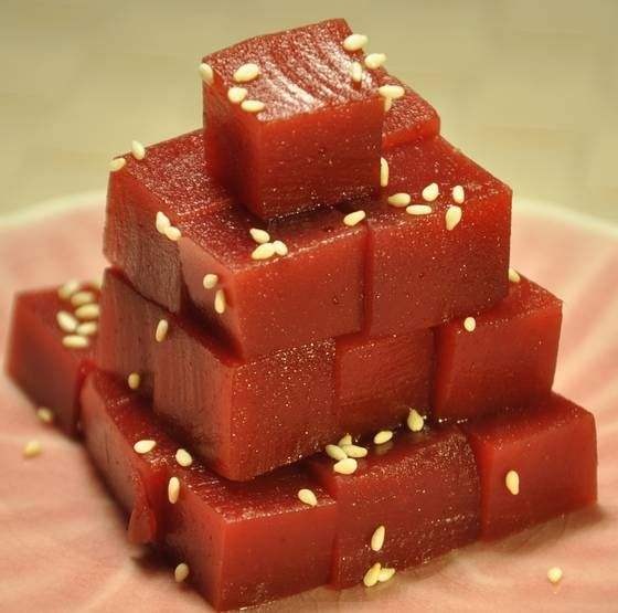 卖扒糕的(以乔麦面为糊,凉之成糕,拌酱油醋食之),吆喝声, “筋豆酸辣来……一大盌来……,一大一盌来……两块来(来源:《北京风俗类征》)