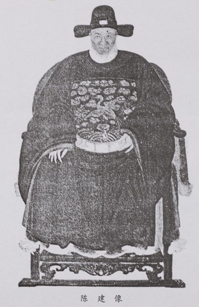 陈建(1497—1567),字廷肇,号清澜,广东省广州府东莞县人(今属广东东莞市)。东莞人。年23补弟子员,试辄居首。嘉靖七年(1528年)中举人。以后两次会试,皆中副榜,选授福建侯官县教谕,时年36岁。在任期间,与督学潘潢论朱陆异同,作《朱陆编年》二编,与巡抚白贲论李东阳《西涯乐府》,作《西涯乐府通考》二卷,督学江以达命校《十三经注疏》,书成,朝廷颁行天下。七年任 满,迁江西临江府学教授,集编《周子全书》,又为《程氏遗书类编》。