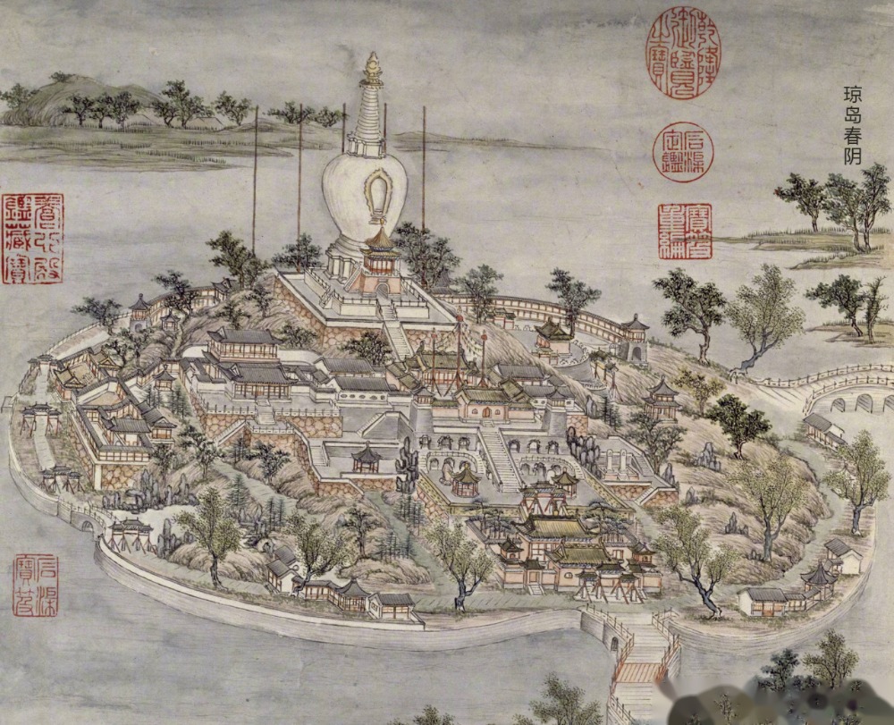 燕京八景之一。《日下旧闻考·形胜》:“琼岛在皇城西北苑中。下瞰池水,环以雉堞,地势坡陀,叠石为山,磛岩磊砢,层叠而上,石磴阴洞,萦纡蔽亏,乔松古桧,深翳森蔚,隐然神仙洞府也。谓之大山子。山顶有广寒殿,殿之四隅各有亭。左二亭曰玉虹、方壶,右二亭曰金露、瀛洲。山半有三殿,中曰仁智,东曰介福,西曰延和。其下太液池,前有飞桥,以通仪天殿,东有石桥以通琼林苑。山之上常有云气浮空,氤氲五采,郁郁纷纷,变化翕忽,莫测其妙,故曰琼岛春云。”明·金幼孜 《琼岛春云》: “蓬莱东望近扶桑,冉冉春云接下方。”杨荣《琼岛春云》:“乍轻树杪和烟湿,轻覆花枝过雨晴。每日氤氲浮玉殿,常时缥缈护金茎。”(来源:中国园林艺术大辞典, 1997-01)